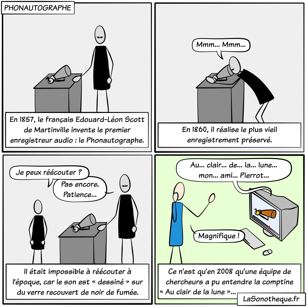 Édouard-Léon Scott de Martinville enregistre "Au clair de la lune" sur son phonautographe, le 9 avril 1860. Donc, en plus d'être le premier de l'Histoire à enregistrer un son, il est aussi celui à avoir réalisé le plus vieil enregistrement préservé (il a probablement fait quelques essais plus anciens, mais ils ont disparu). Ce n'est qu'en 2008 qu'une équipe de chercheurs a réussi à lire cet enregistrement, dont voici une écoute :